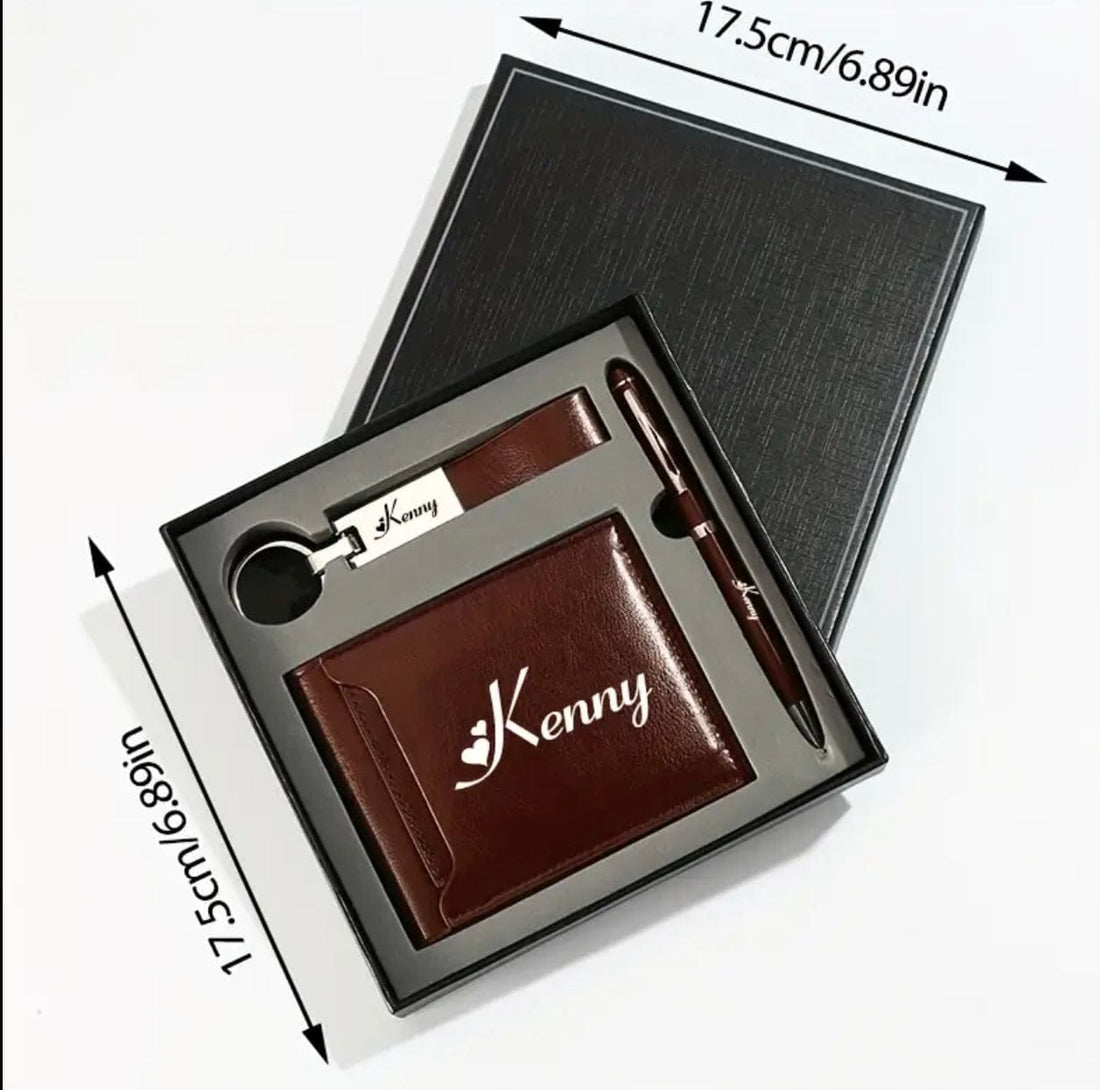 Gepersonaliseerd Cadeau Set voor Mannen – Gegraveerde Portefeuille, Pen en Sleutelhanger