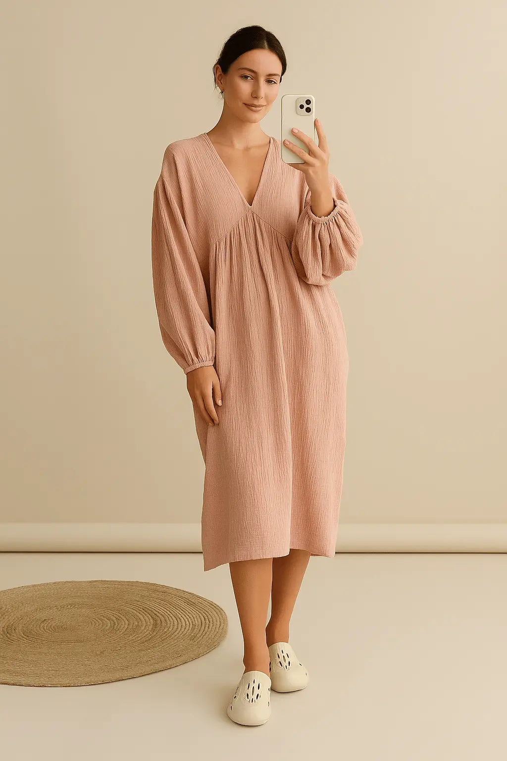 Lange strandjurk van katoen en linnen - V-hals - Vloeiend en licht