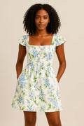 Met zijn delicate bloemenprint en vleiende korte snit is deze witte mini-jurk een ode aan vrouwelijke zomerstijl. De volantmouwen geven een romantisch tintje terwijl het knoopsluitende lijfje de silhouet elegant structureert. Een licht en stralend model, perfect om je zonnige dagen te verfraaien.