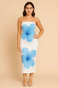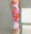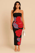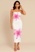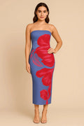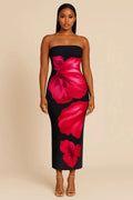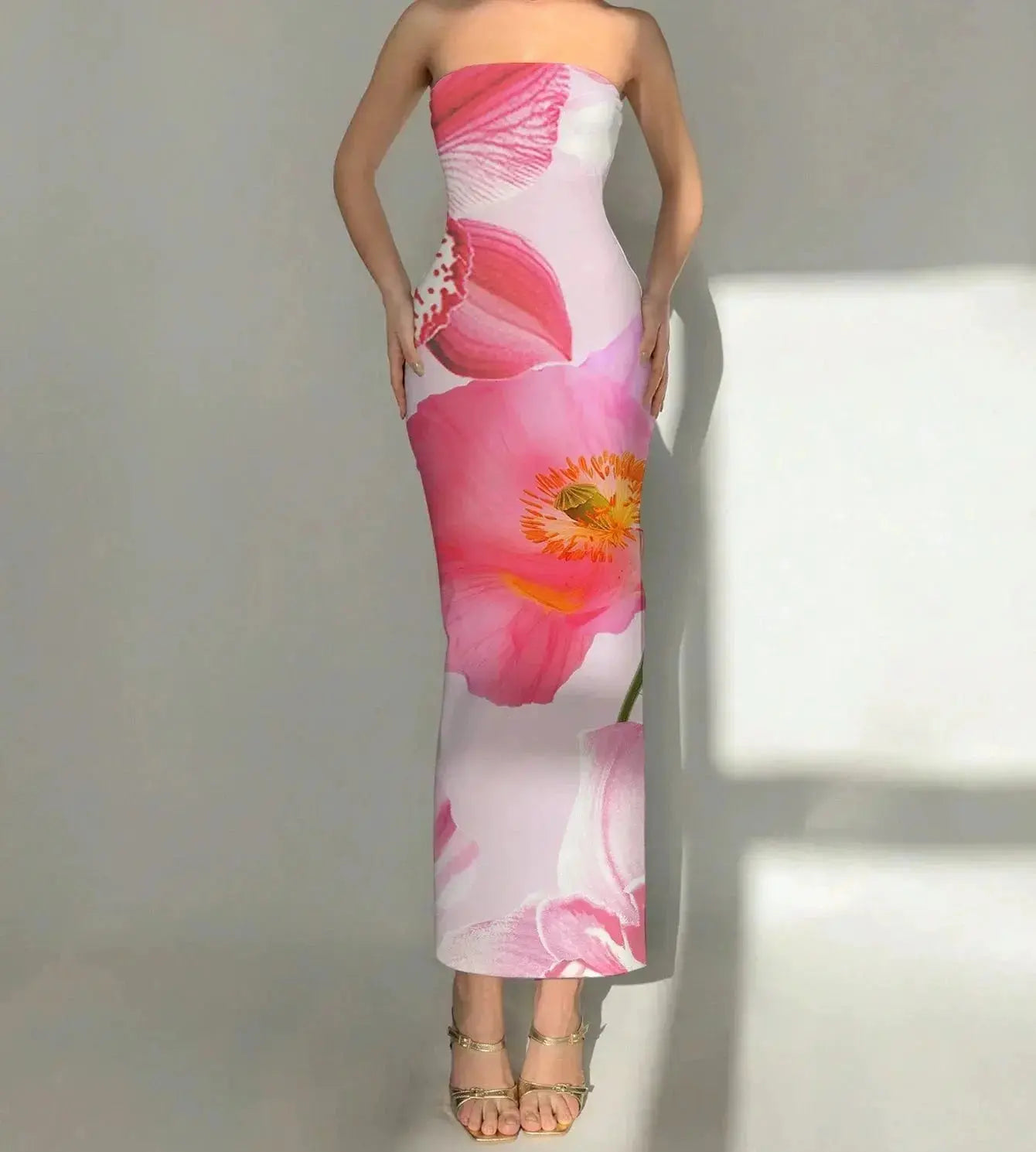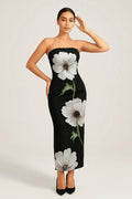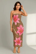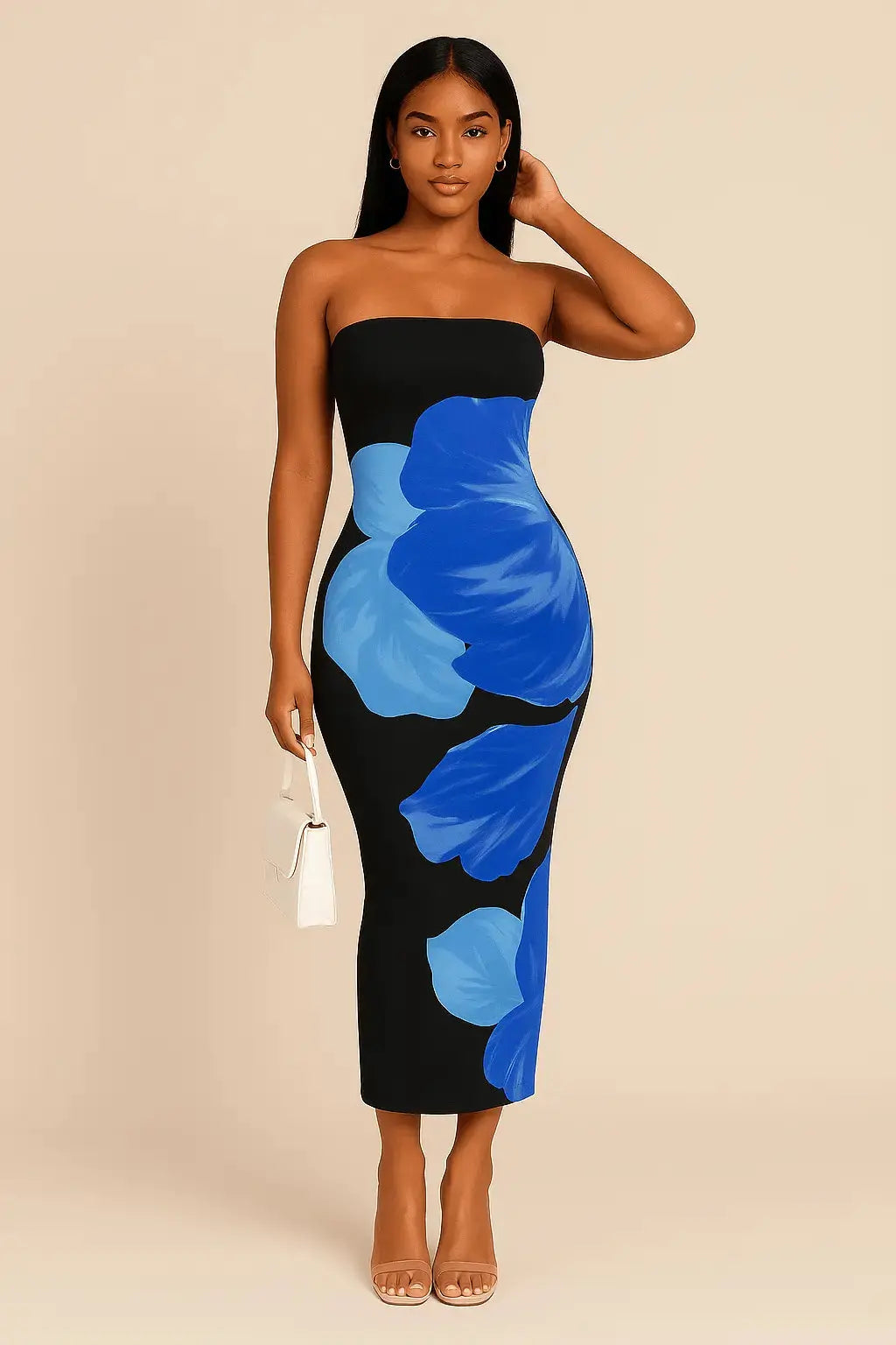 Met zijn mouwloze ontwerp en bandeau-halslijn laat hij de schouders vrij. Het bovenstuk sluit zachtjes aan op de borst, terwijl de rechte rok het silhouet verlengt. Makkelijk te dragen met fijne sandalen of subtiele hakken, geschikt voor een diner, feest of zomerse gebeurtenis.