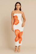 Deze lange bloemenjurk met contrast valt op door zijn blote schouders en uitgesproken bloemenprint. De vloeiende snit benadrukt het silhouet en biedt tegelijkertijd veel bewegingsvrijheid. Het spel van contrasten tussen de kleurrijke bloemen en de neutrale basis geeft hem een uitgesproken stijl, zonder te druk te zijn.