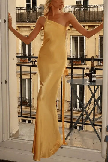 Sukienka długa Clara – satynowy odkryty tył i asymetryczne ramiączka