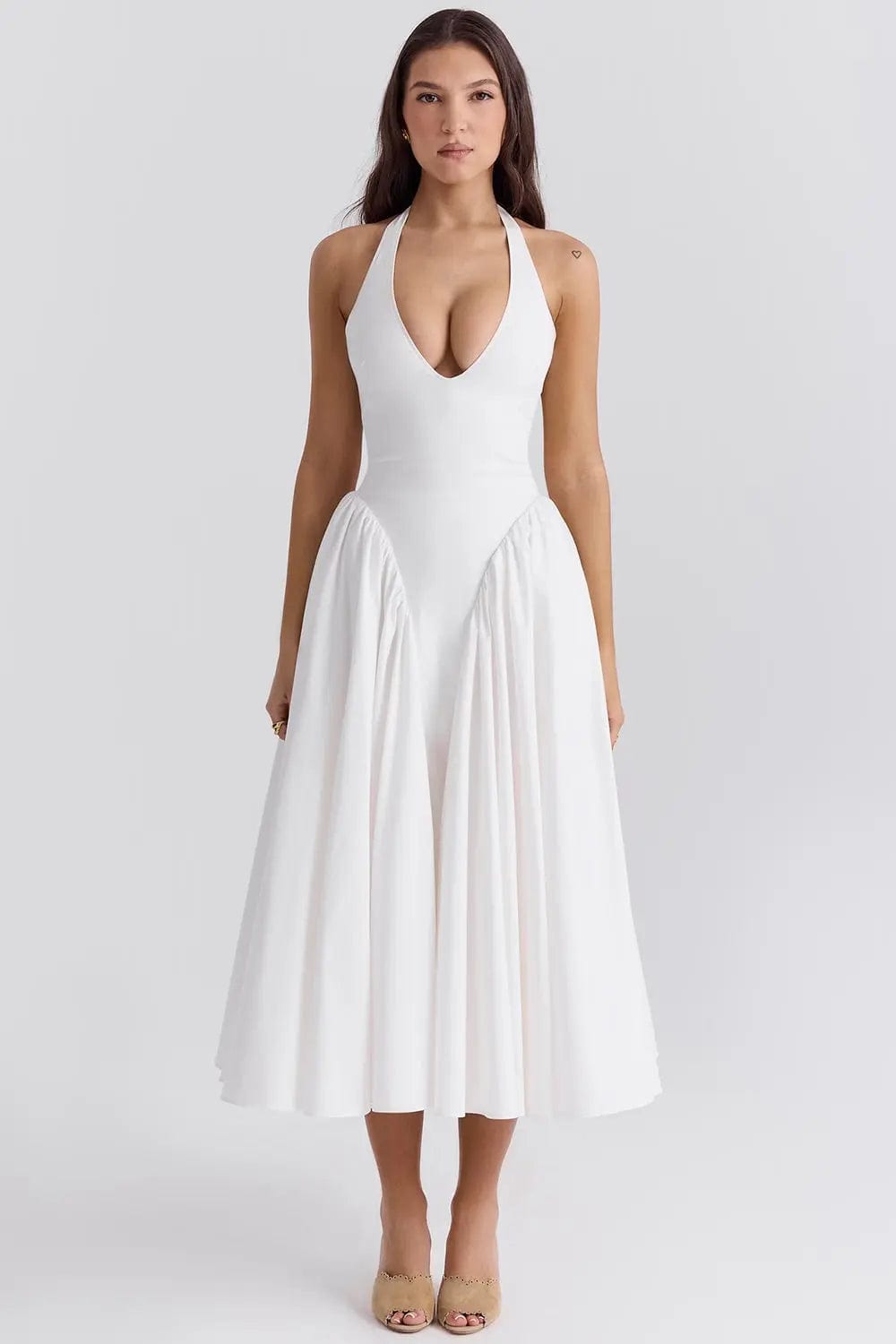 Sukienka długa Mila – Dekolt halter głęboki i smukła objętość