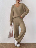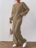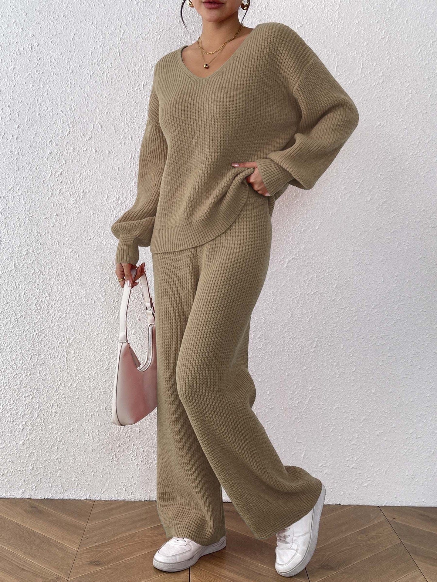 Zestaw z dzianiny 2 części – luźny sweter z dekoltem w serek i szerokie proste spodnie jednolite