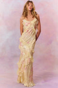 Pozwól się uwieść powietrznej elegancji długiej sukni Maya. Dzięki delikatnie kwiatowej tkaninie i asymetrycznym falbanom, ucieleśnia ona łagodność pięknych dni z ultra kobiecym akcentem fantazji.