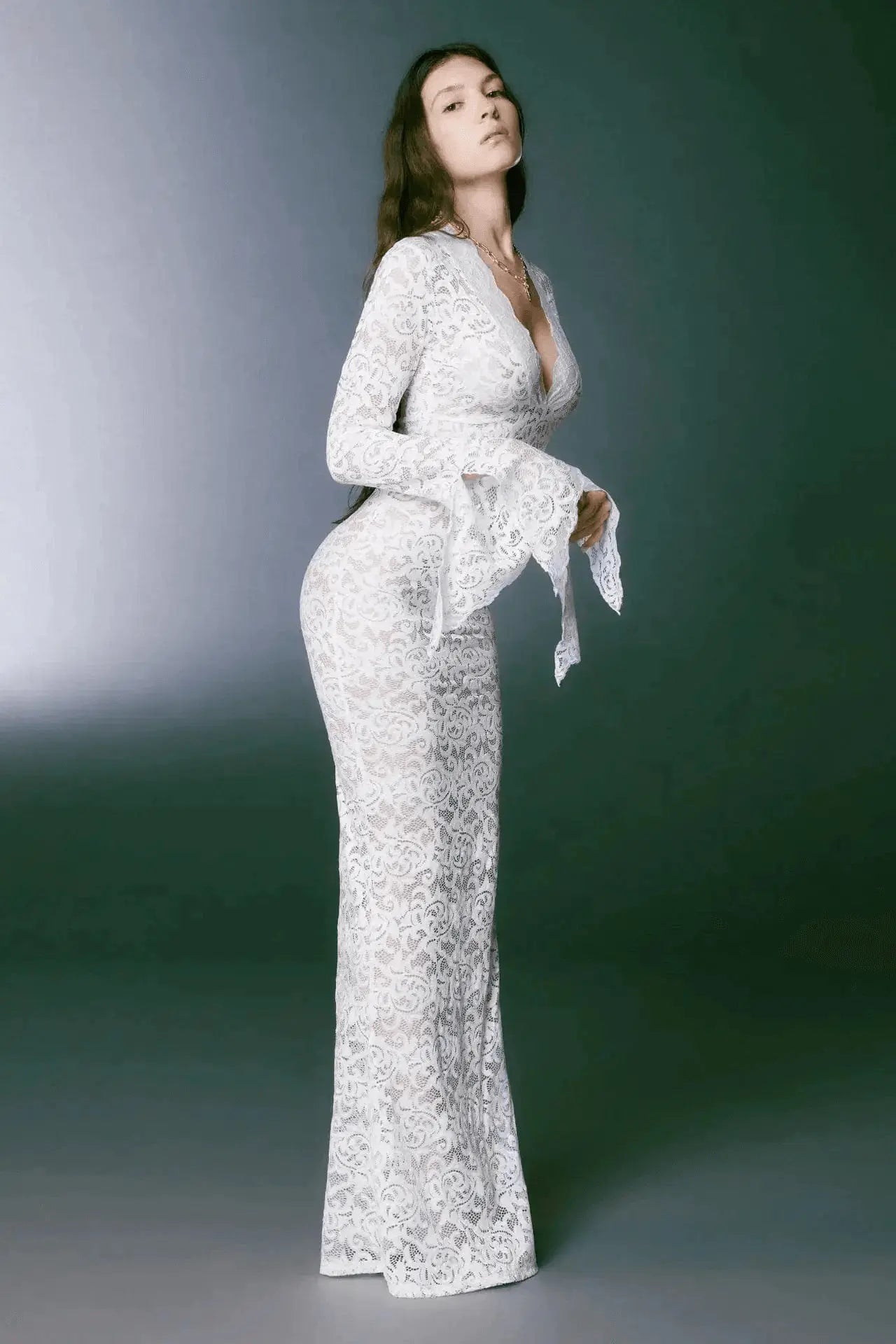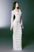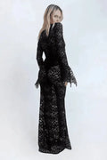 La robe longue en dentelle transparente Mélodie se distingue par son jeu de transparence maîtrisé et sa coupe près du corps. Confectionnée dans une dentelle florale légère, elle épouse la silhouette tout en conservant une certaine souplesse. Son encolure légèrement plongeante et ses manches longues à finition évasée créent une ligne élégante, à la fois sobre et affirmée.