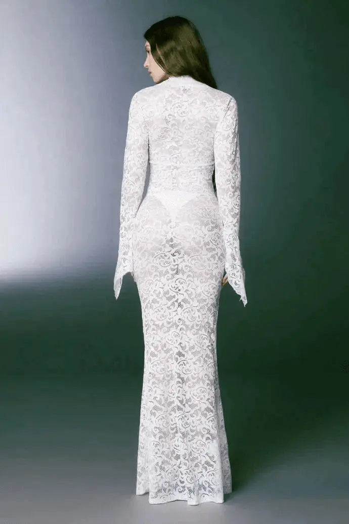 Robe longue tarnsparente Mélodie en dentelle avec manches longues