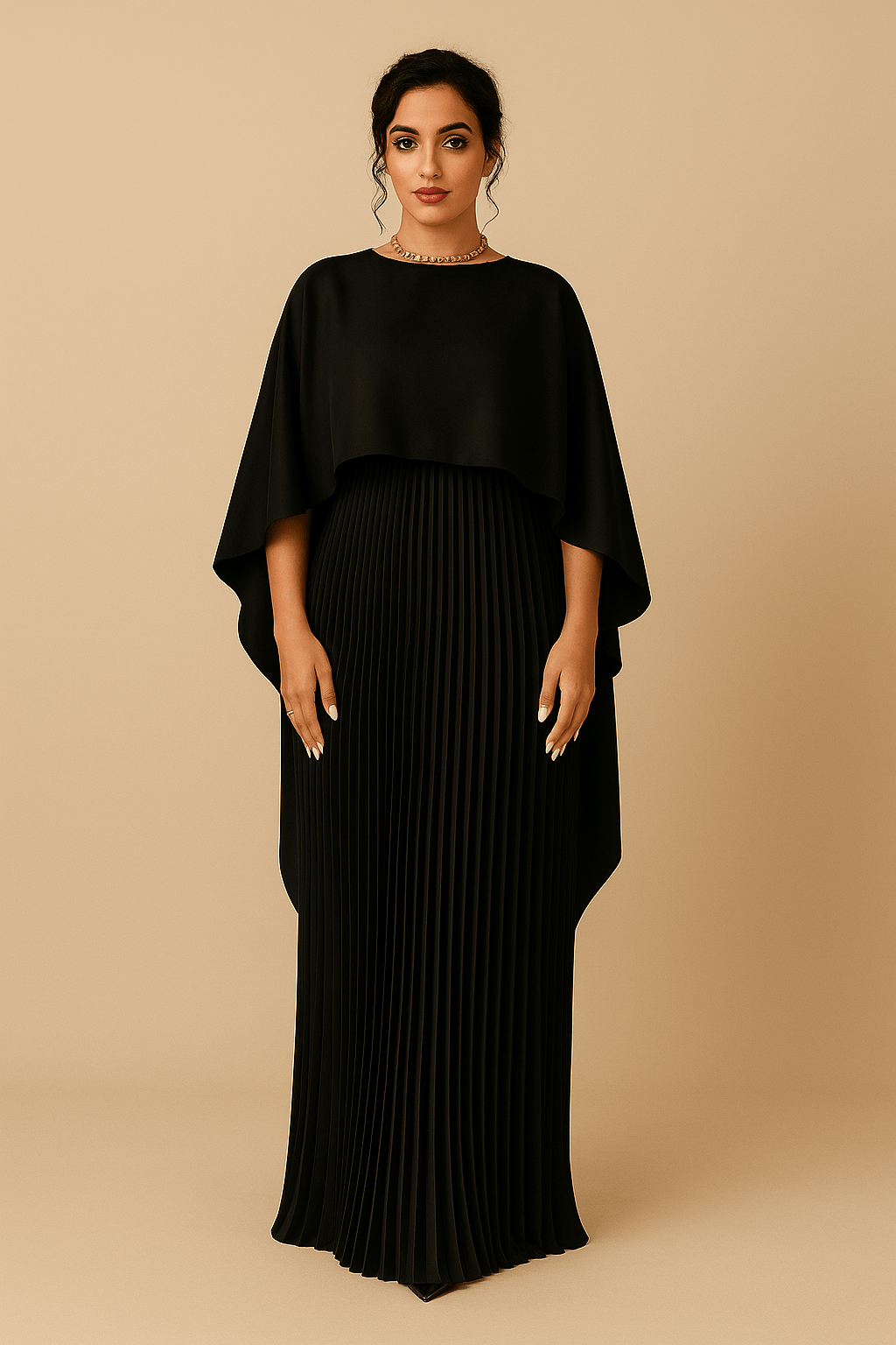 La robe longue verte à cape fluide incarne le parfait équilibre entre sophistication, fluidité et structure. Conçue pour magnifier la silhouette tout en offrant une aisance absolue, elle enveloppe le haut du corps d’une cape légère qui danse à chaque mouvement. Le bas plissé apporte une touche couture subtile, pour un effet majestueux dès l’entrée dans la pièce.